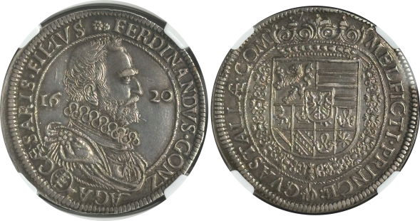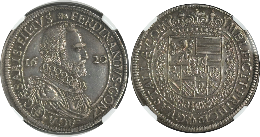 1624. Bohemia. Ferdinand II, 1592-1618-1637 Taler. Joachimstal Mint. Mintmaster:. Gregor Steinmüller. Obv: Emperor stands in armor, holding scepter and orb. Rev: Crowned double eagle with breastplate. A sharp specimen, offering great luster and peripheral toning for this Bohemian crown type. PCGS AU-58.
