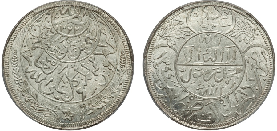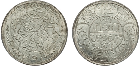 Yemen. Al-Mutawakkil Yahya bin Muhammad, as Imam and King. AH 1344 (1925-1926) Imadi Rial, AH 1344 (1925). KM-Y-7. Struck over a number of years without changing the date of this coin, this crown sized coin is very well produced and preserved. Silky luster and problem free surfaces. It is the finest specimen graded PCGS MS-67+.