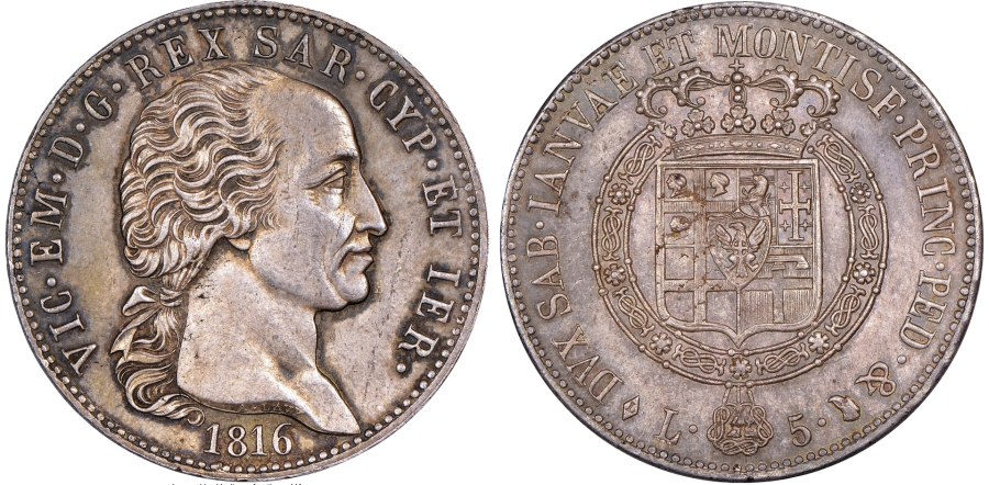 1816. Sardinia. Vittorio Emanuele I 5 Lire 1816 (Eagle)-L. Turin mint. DAV-133. KM-113. Pag-10. Mont-24 (R2), MIR-1030a (R2). A show-stopping and in all respects magnificent offering for the elusive first-year of this seldom-seen type, the surfaces retaining seemingly unmatched originality that showcases pinpoint design details, only the most inconsequential instances of contact and a remarkable palette of tone that is composed of silver and olive in the open areas and darkens around the raised surfaces to further embolden the motifs. For the sake of completeness, we note a small planchet inclusion in the upper left portion of the shield on the reverse, but its presence is absolutely trivial on the whole. Truly a magnificent coin!...and one that could quite possibly shoot right past our estimate range, as it's difficult to predict when the next opportunity to acquire another example of this date in this immense quality will come along. NGC MS-64.