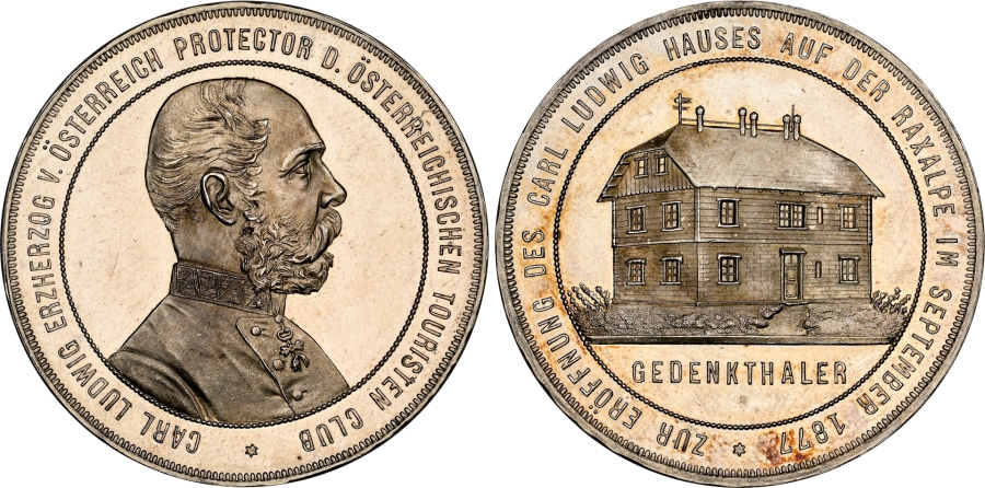 1877. Austria. Vienna Mint. Franz Joseph I (1848-1916) "Carl-Ludwig House" Taler. DAV-30, J-371, Thun-462. Struck for the opening of the Carl-Ludwig House in the Rax (Alpine mountain range). This type was created in an extremely limited mintage of only 100 examples, guaranteeing its unavailability to all but a few collectors. NGC PF-64 Ultra Cameo.