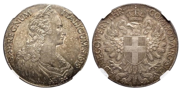 1778-M. Italy. Milan. Maria Theresia (1740-1780 Scudo (6 Lire). DAV-1386. KM-C36, 23.13g. Well struck with lovely rich antique patina, satiny luster. The first regular, machine struck crown type of Milan. Very rare quality for the type as Maria Theresa was very unpopular in Milan during this period and many of the coins issued with her portrait were defaced. NGC MS-62.