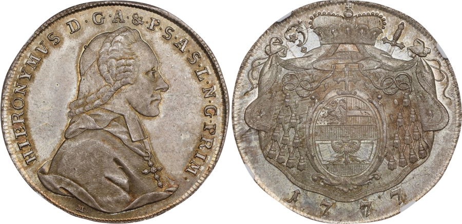 1777. Salzburg. Hieronymus. Count Von Colloredo-Waldsee (1772-1803) Taler. DAV-1263. Stunningly attractive and robustly appealing, this Gem radiates with an intense array of brilliance in the fields, subtle frostiness imparted unto the devices, and a slight degree of golden-champagne toning nearer the peripheries. NGC MS-65+.