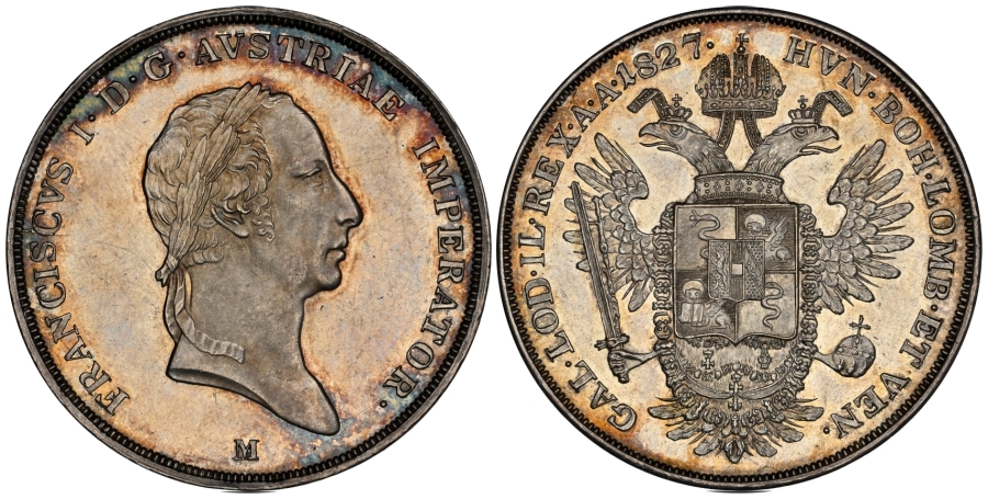 Emperor Franz II (I). Rev. Crowned double-headed eagle with arms on breast. Impressively struck, the devices cloaked in vibrant cerulean and seafoam tones over surfaces demonstrating clear underlying