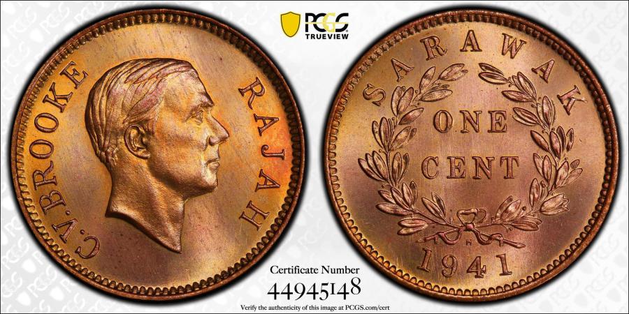 1941-H. Sarawak - Charles V Brooke Type II, 1941-H Specimen One Cent - A superb example of this key SE Asian rarity, fully brilliant red and with