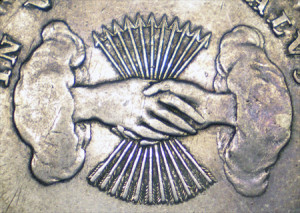 The iconography on the coinage stressed the unity of the state. On the Florin, this was represented by the individual display of all the coats-of-arms of the 11 states which had merged; on the 10 sols, it was represented by ten arrows behind a two shaking hands.