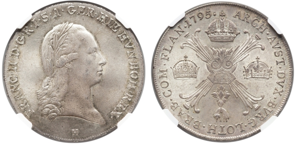 1755 Austrian-Netherlands. Duchy of Brabant (Belgium). Antwerp Mint. Maria Theresia (1740-1780) Kronentaler. Delmonte 387, Davenport 1282, Eypelt. 437, Voglhuber 287. Obv: St. Andrew's Cross, in the corners 4 crowns. Rev: Double-headed eagle with coat of arms on the chest. Conditionally scarce without commonly seen adjustment marks. NGC MS-64.