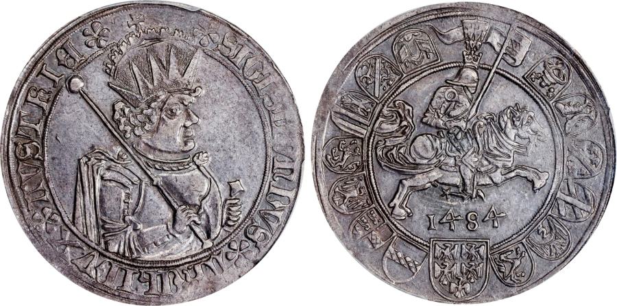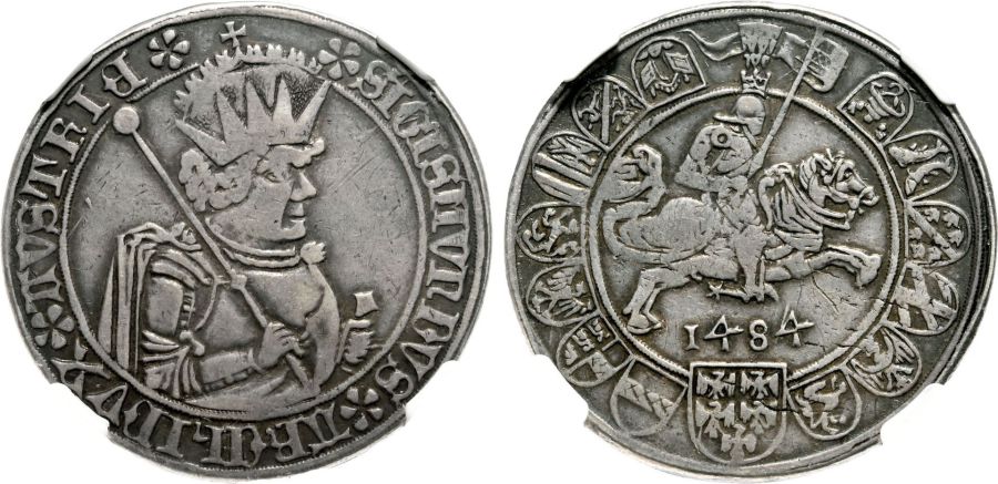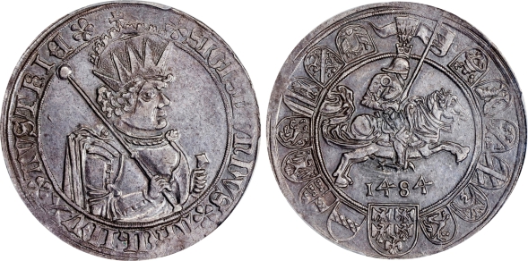 bust right, holding scepter and resting hand on hilt of sword / Knight in German Gothic armor, holding banner, on caparisoned horse galloping right. Rev: 1484 below; helmet decorated with