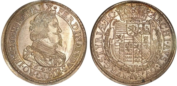 1652-KB. Ferdinand III (1637-1657) Taler. Kremnitz Mint. DAV-3198. Strong strike for the type, highy lustrous. highly desired in such condition. This remarkable Taler has survived the test of time and man. Many Talers don't exhibit the type of delicate champagne tone on both sides that are accentuated by light amber highlights gracefully. Nor surfaces that are virtually unscathed. Minuscule weakness exists in the strike within the peripheries but considered the splendid overall condition it's irrelevant. Elegantly sharp comes to mind when viewing this offering. NGC MS-64.