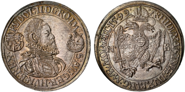 1604. AUSTRIA. Rudolph II (1576-1612) 3 Taler. 45.5mm, 5.44mm thick, 85.92 gr. DAV-3003. KM 59. Hall Mint. Obv: Armored laureate bust r. in circle, date at truncation. Rev: 16-fold oval Shield in Collar of the Golden Fleece with Latin titles NEC NON ARCHIDVCE-S A. DVC. BVR. CO: TIROL, Not Only Archdukes of Austria, (plural) but Duke of Burgundy, Count of Tyrol (singular). Dav.3003, .Obv: RVDOLPHVS.II.D.G:IM:SEM:HV:BO:REX Bust right with date below. NGC AU-58.