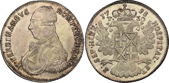 1798. Order of Malta. Ferdinand Hompesch 30 Tari, KM-345.3, DAV-1611b, Schembri-3. A striking, one-year type that is believed to have been struck by the French during their occupation, featuring the armored bust of Ferdinand Hompesch and crowned imperial eagle. Broad, with incredibly original surfaces that glisten with an exciting amount of mint luster and minor, yet hardly disturbing adjustment marks. The reverse is sublime with highlights in a delicate shade of antique gold that are woven through much of the devices and produce a warm glow. Currently the finest-known certified specimen of this type, and highly engaging as such. NGC MS-63.