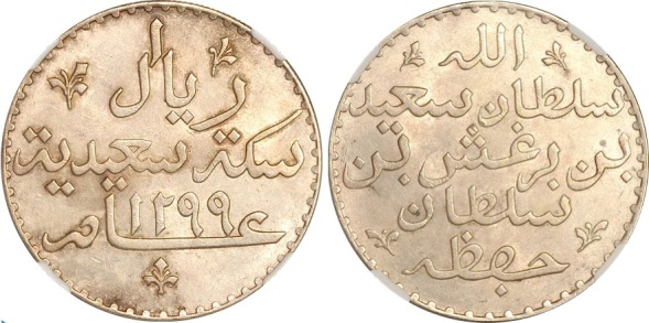 1882 (AH 1299/AD 1882). Tanzania, Colonial. Zanzibar. KM-4, DAV-89. Sultan Sayyid Barghash bin Said al-Busaid (1870-1888) Riyal. AR Riyal (37mm, 27.11 g, 6h). Mintage: 60,000. Obv: Legend in five lines containing name and title; floral sprigs around. Rev: Legend in three lines containing denomination and AH date; floral sprigs around. An impressive coin with light overcast sky coloration and loads of underlying luster. A one year type, Barghash Ibn Sa'id Riyal is the only crown-sized issue of Zanzibar, and one of the world's most popular Crowns. NGC MS-63.